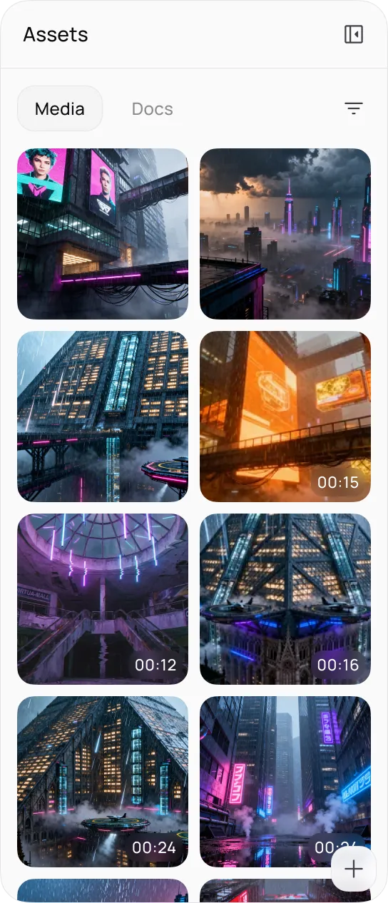 Stop searching for assets. Access millions of stock images, videos, and hundreds of AI voices. Or, freely upload your own files, text, and URLs—all in one place.