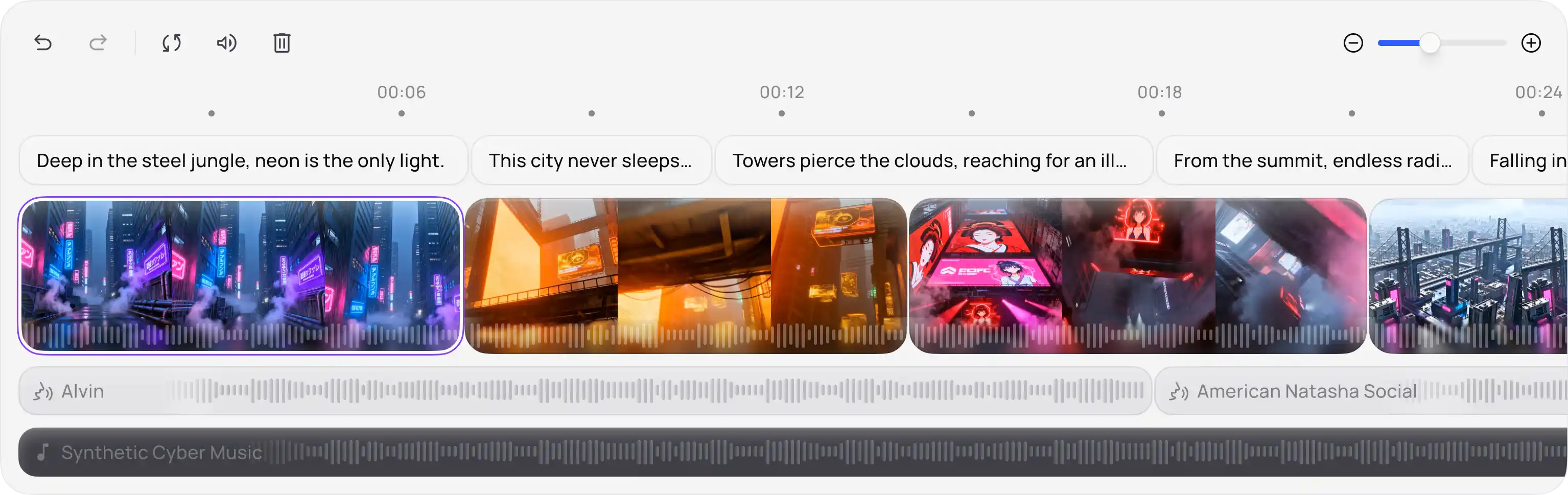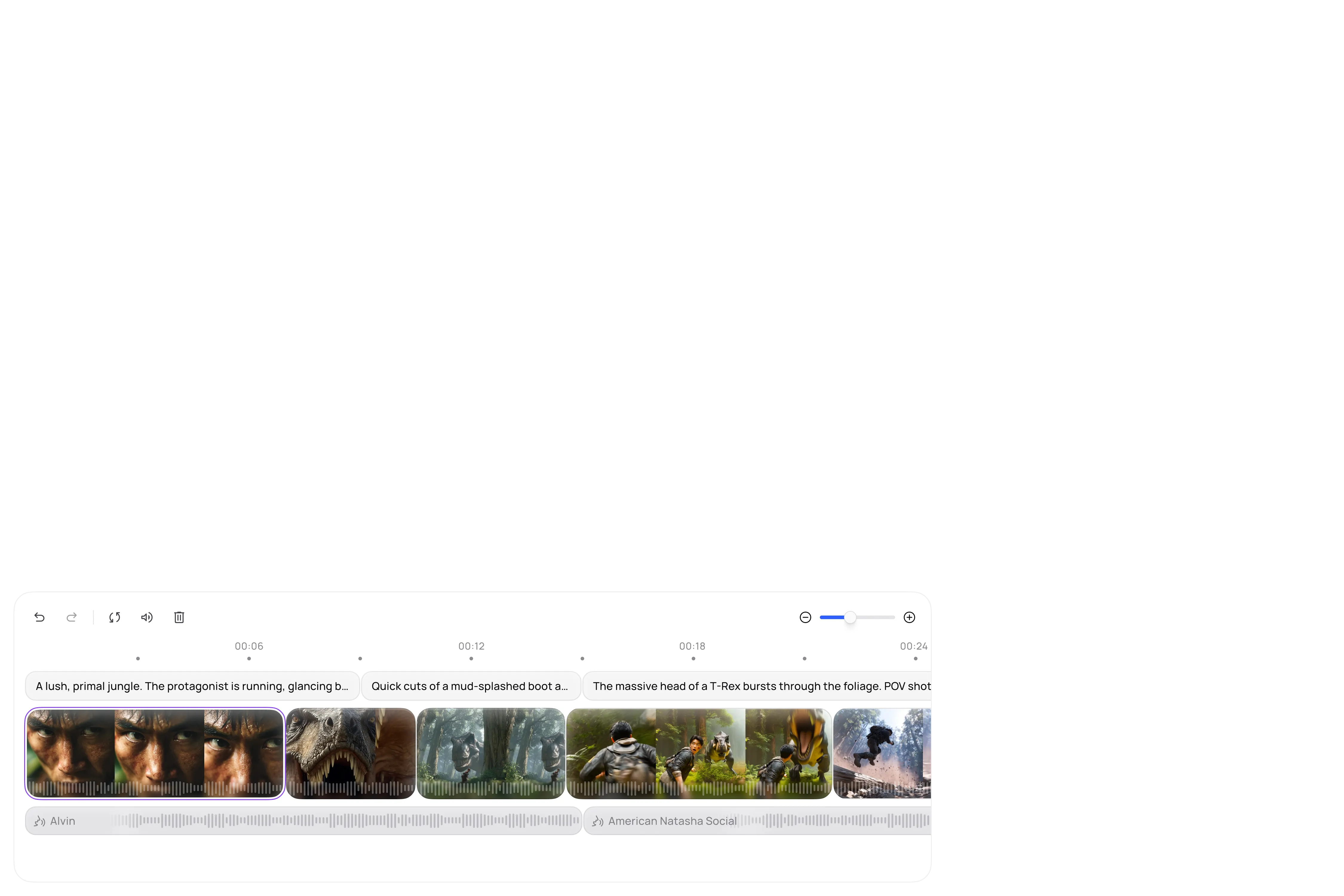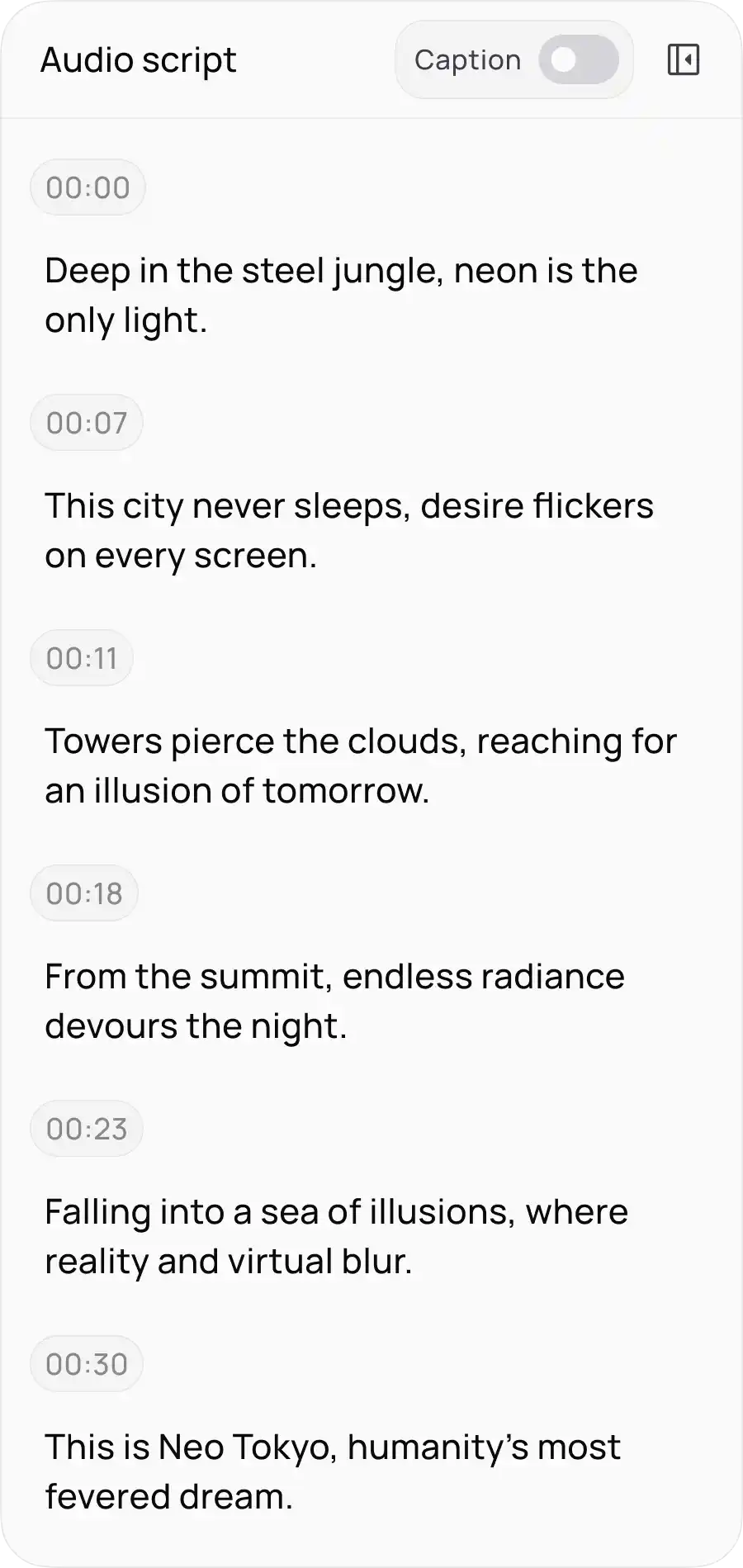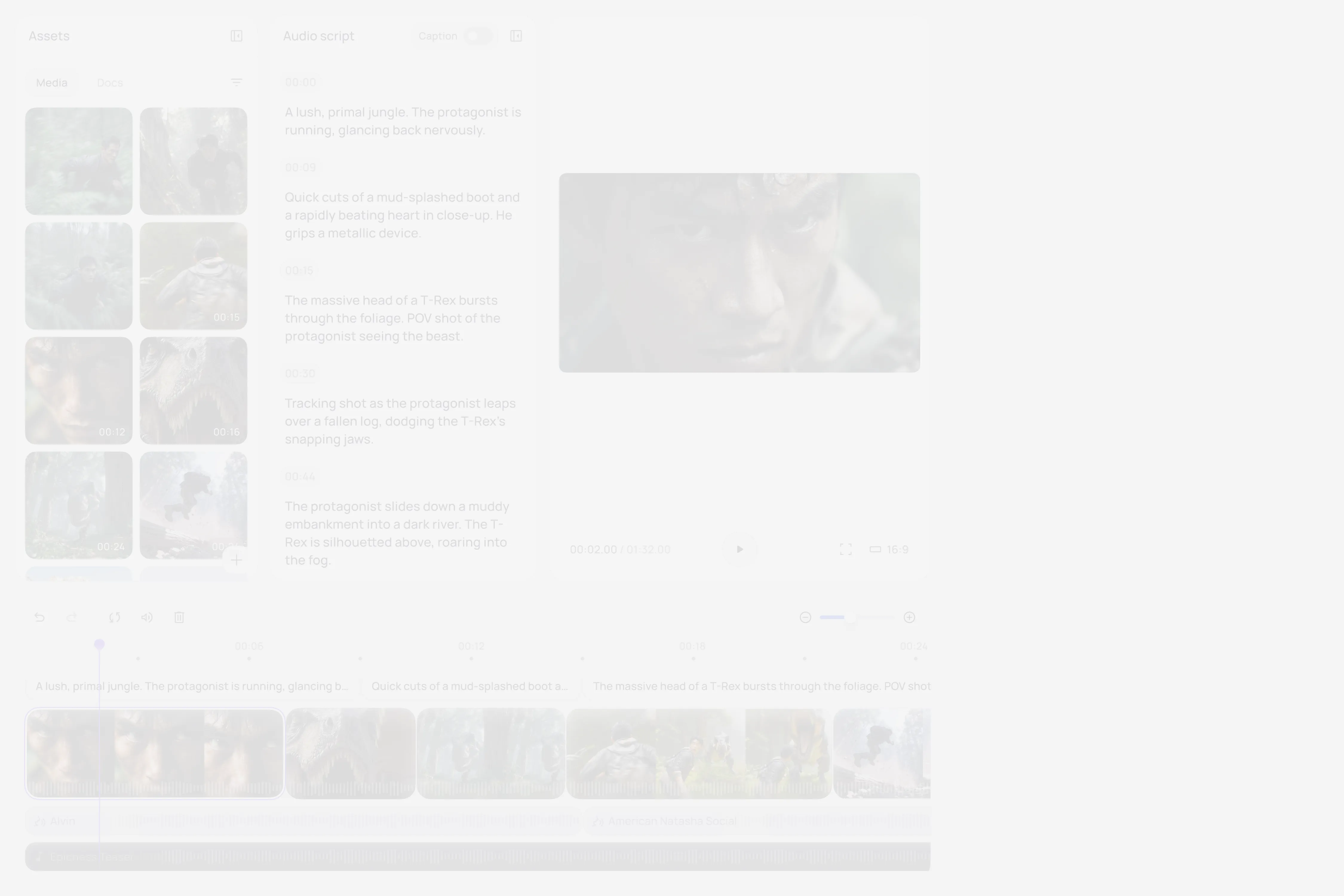 Take full control, simply. Intuitively modify and drag every sound, subtitle, and asset. The track stays perfectly synced with your script, so you never lose your place.