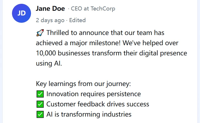 Copy and paste your LinkedIn post URL or paste the post text directly. Works with all post types.