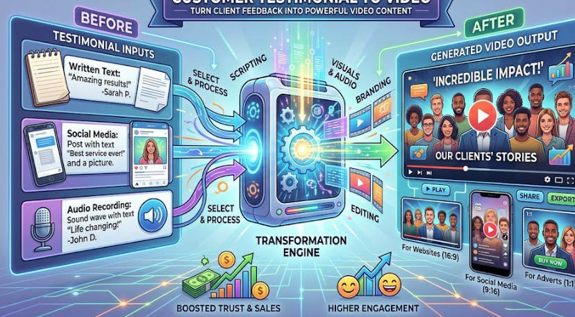An AI Customer Testimonial to Video Generator is a tool that converts written customer feedback into structured video content. Using artificial intelligence, it analyzes testimonials, extracts key insights, and turns them into engaging video narratives with visuals, captions, and voiceover. These videos help businesses communicate value more effectively and increase credibility.
