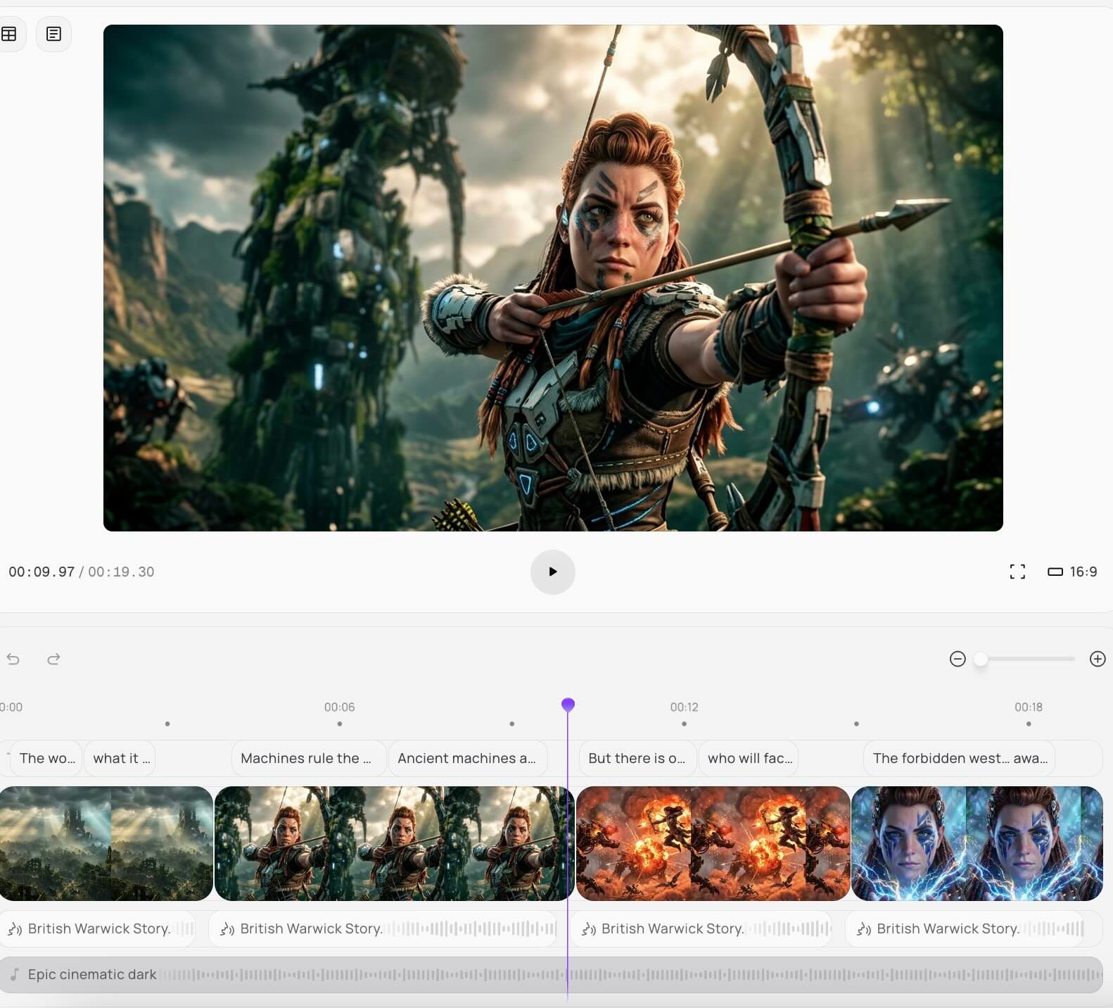A Horizon Forbidden West Video Generator is an AI-powered tool that transforms gameplay footage into cinematic videos. It detects key moments such as machine battles, exploration scenes, and story highlights, then edits them into engaging montages or narrative videos. Medeo makes it easy to create professional-quality content without manual editing.