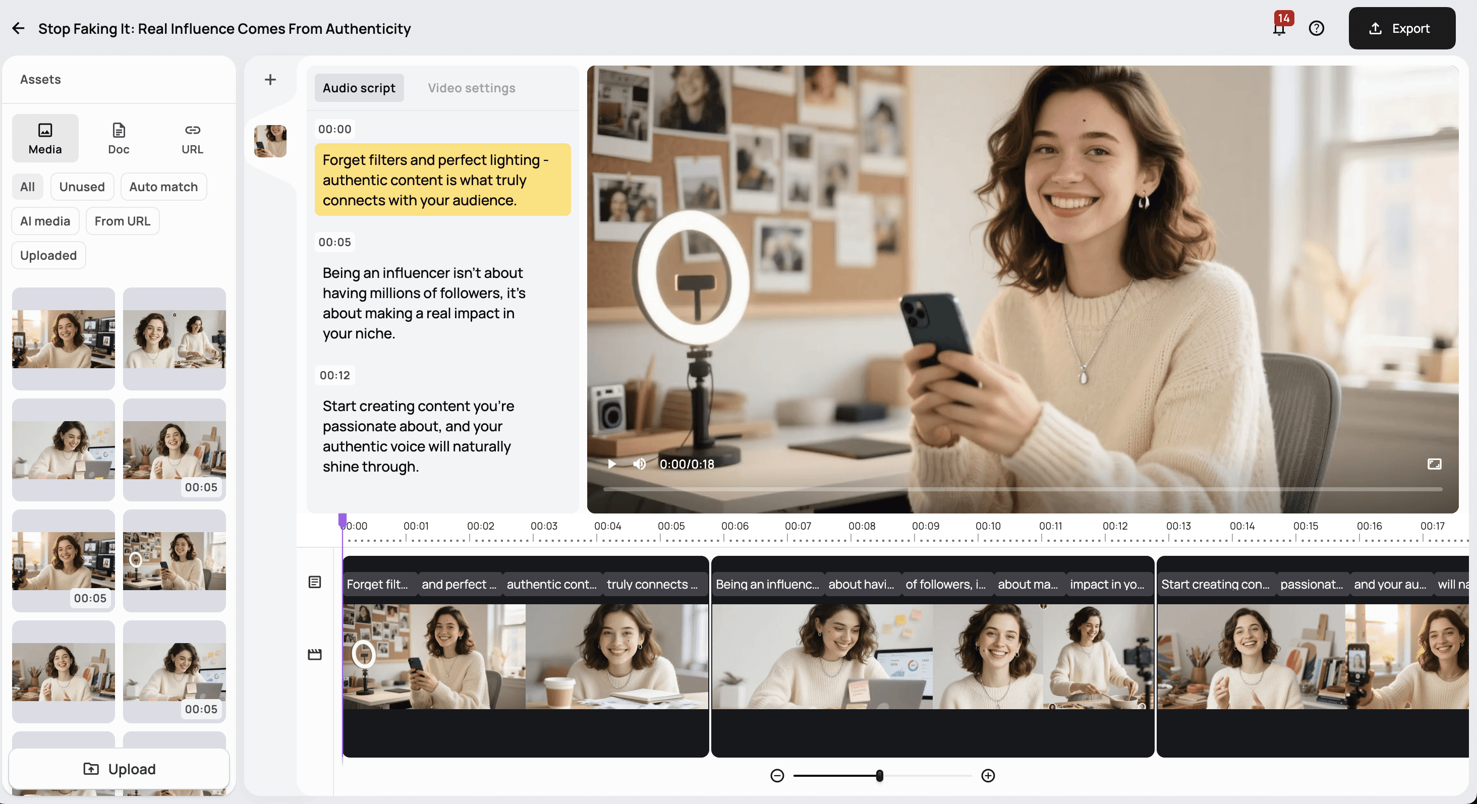 Select from lifestyle, beauty, tech, or fitness influencers—or create your own avatar.