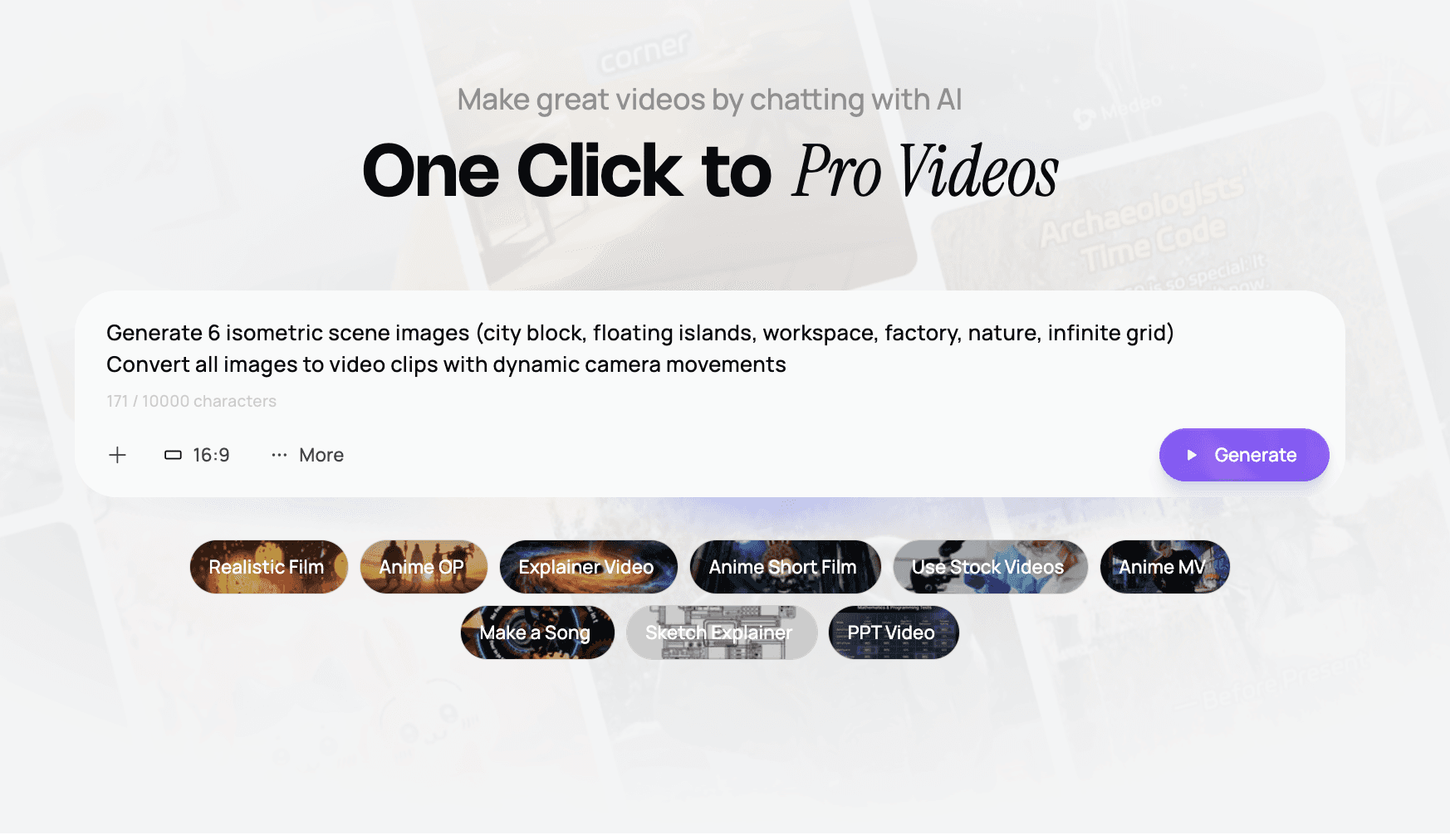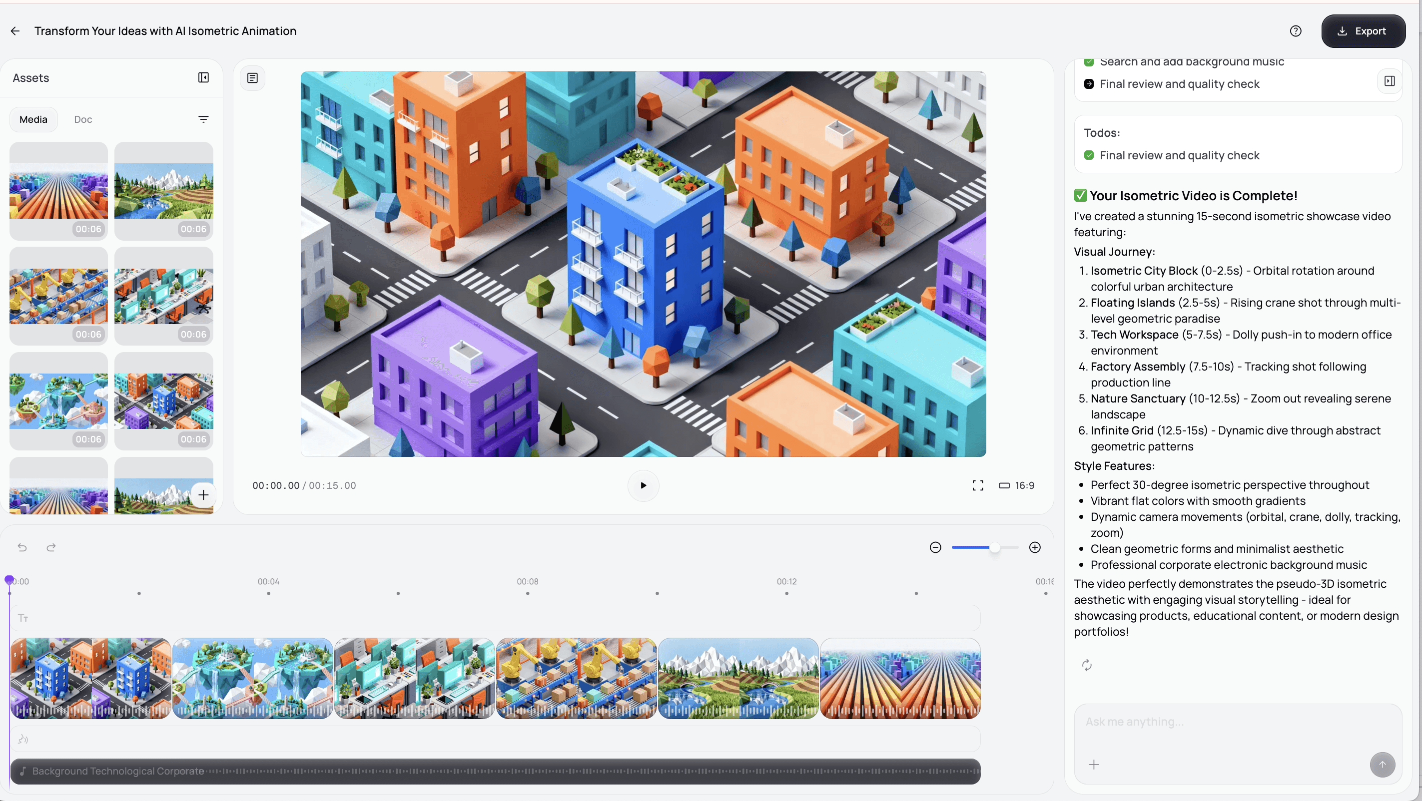 Turn scripts, concepts, or prompts directly into animated isometric scenes.