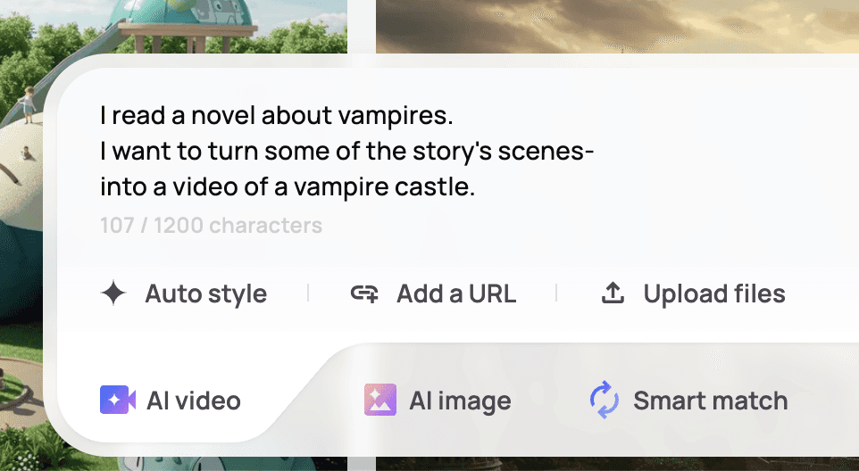You can use:Novel excerpts,Book scenes,Fanfiction passages,Original writing,Short stories,Script dialogues and Worldbuilding descriptions. If it’s text, AI can visualize it.