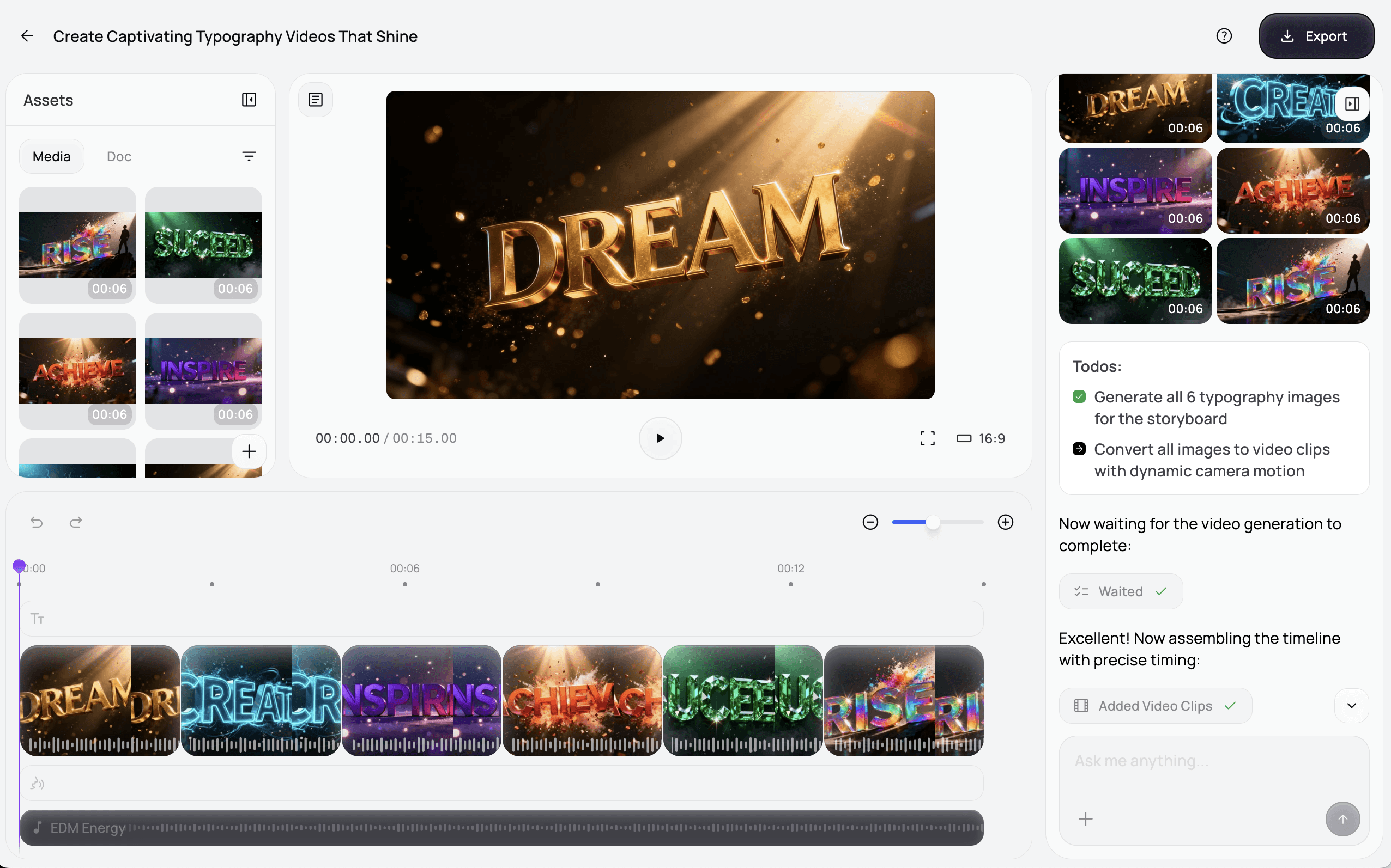 Generate stunning typography videos with AI. Our online tool helps you create dynamic text animations quickly and easily for social media, marketing, and more.