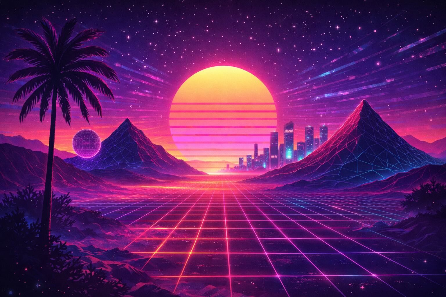 Incorporate iconic vaporwave elements like statues, palm trees, and pixel-inspired visuals.